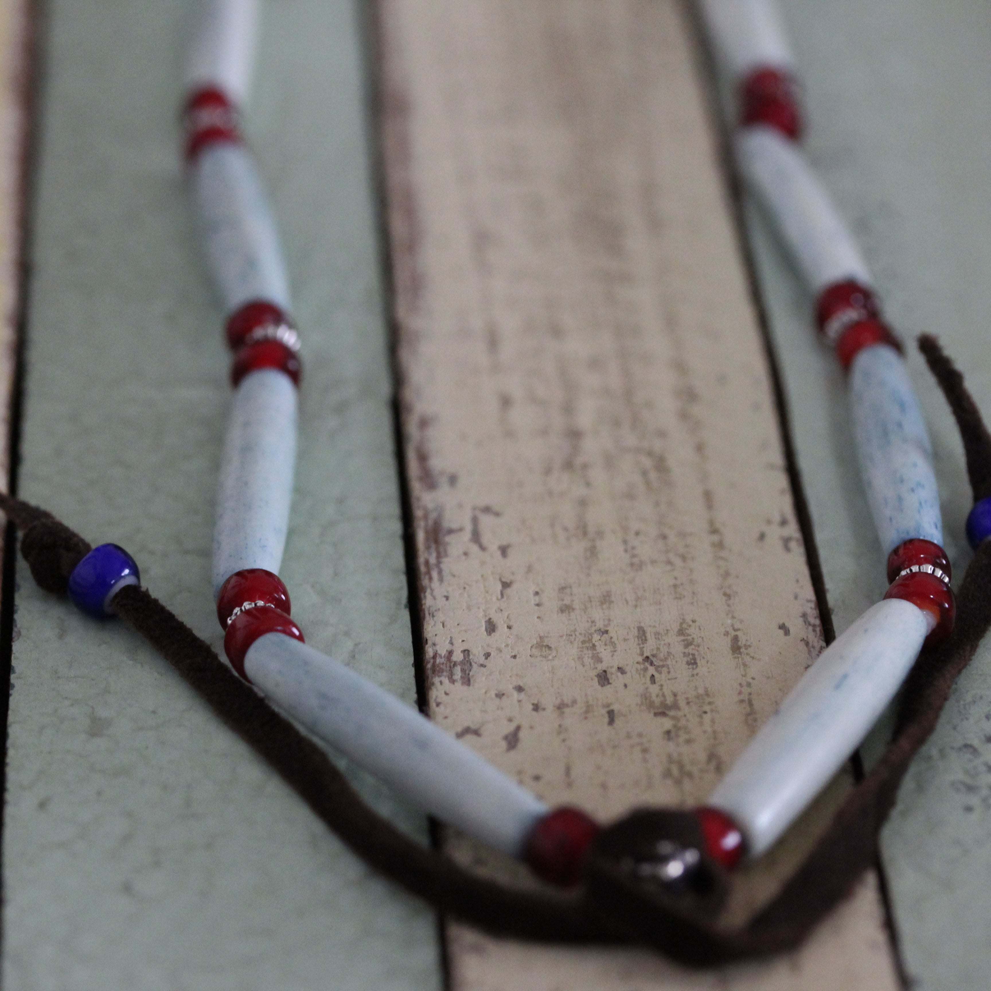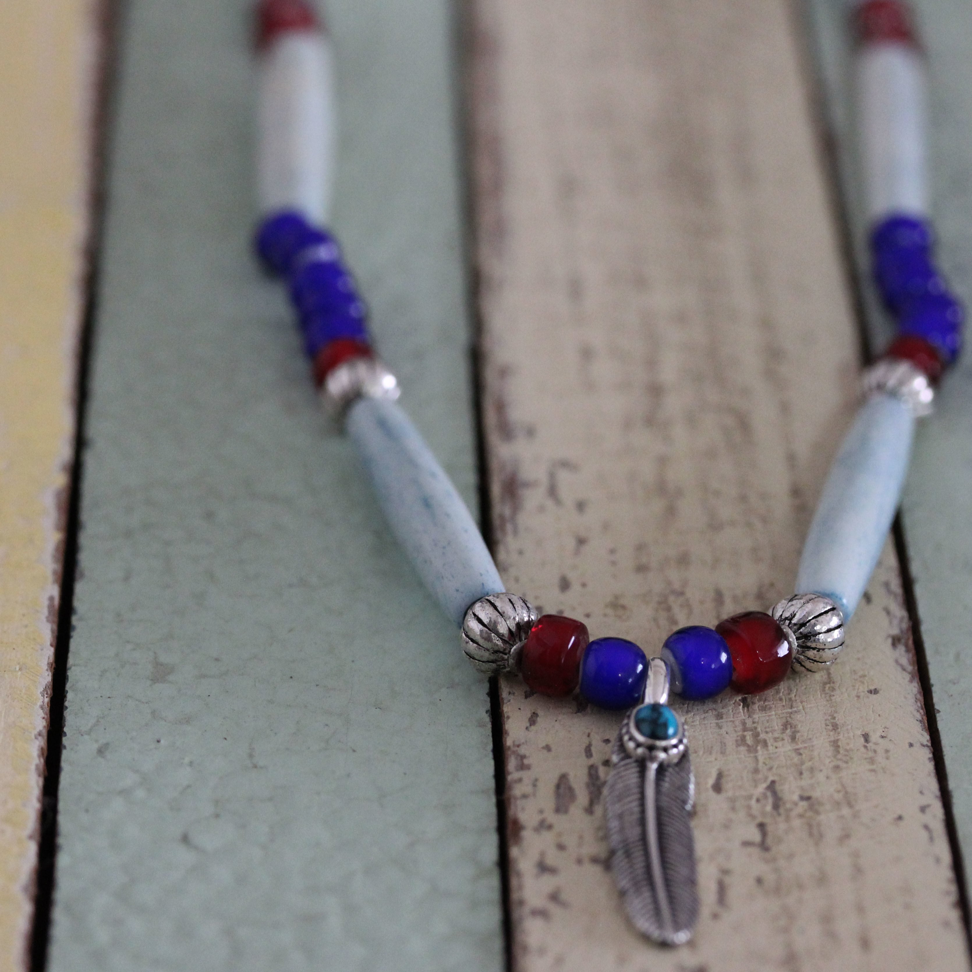 ♪ご覧頂き有難うございます♪ 藍染ボーンビーズ・ホワイトハーツ・ブラスビーズを ネイティブ調にアレンジしセンターにシルバー925フェザーを あしらったネックレスです。 サイズ:55㎝ ※3%前後の+-誤差はご了承くださいませ。 クオリティ:ボーン・ホワイトハーツ ブラスビーズ・シルバー925
