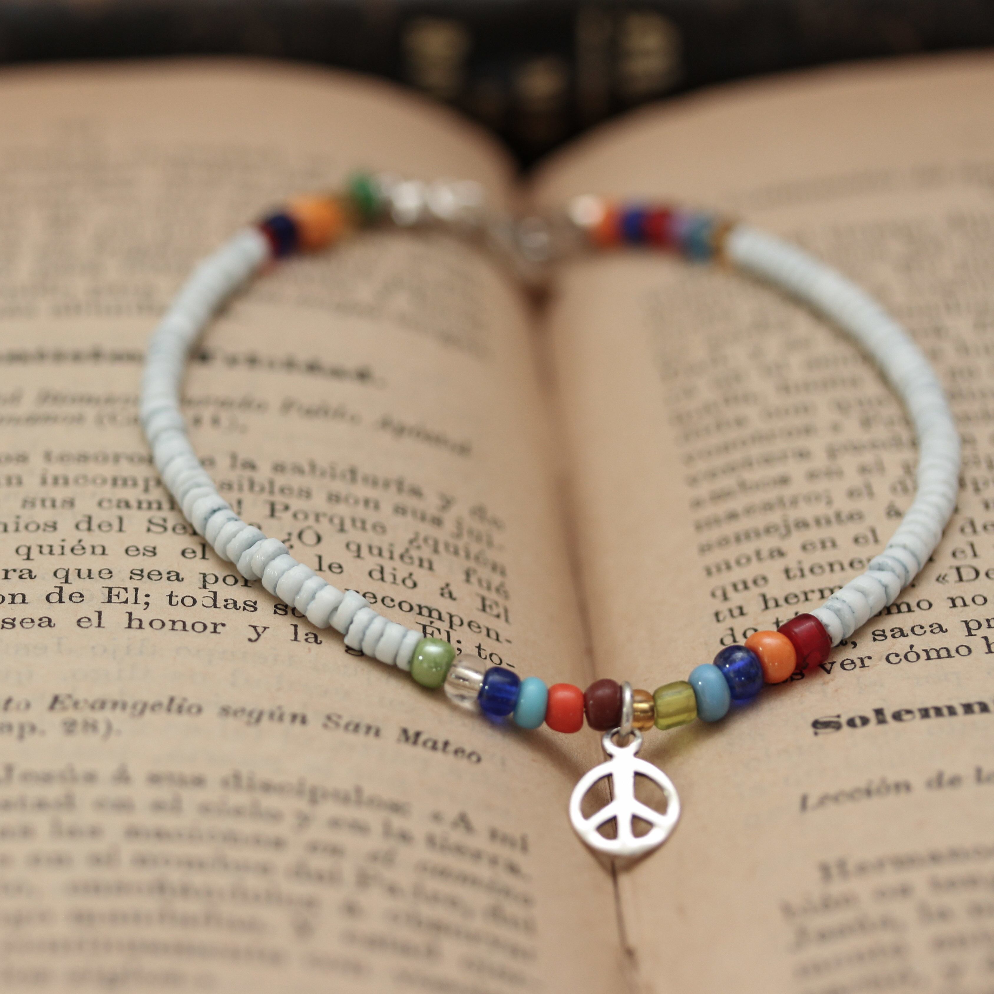 ♪ご覧頂き有難うございます♪ 藍染シェルビーズのアンクレットに silver925ピースマークチャームを あしらったアンクレットです。 男女兼用でお使いいただけます。 サイズ:24㎝ ※3%前後の+-誤差はご了承くださいませ。 クオリティ:シェル・クリスマスビーズ silver925