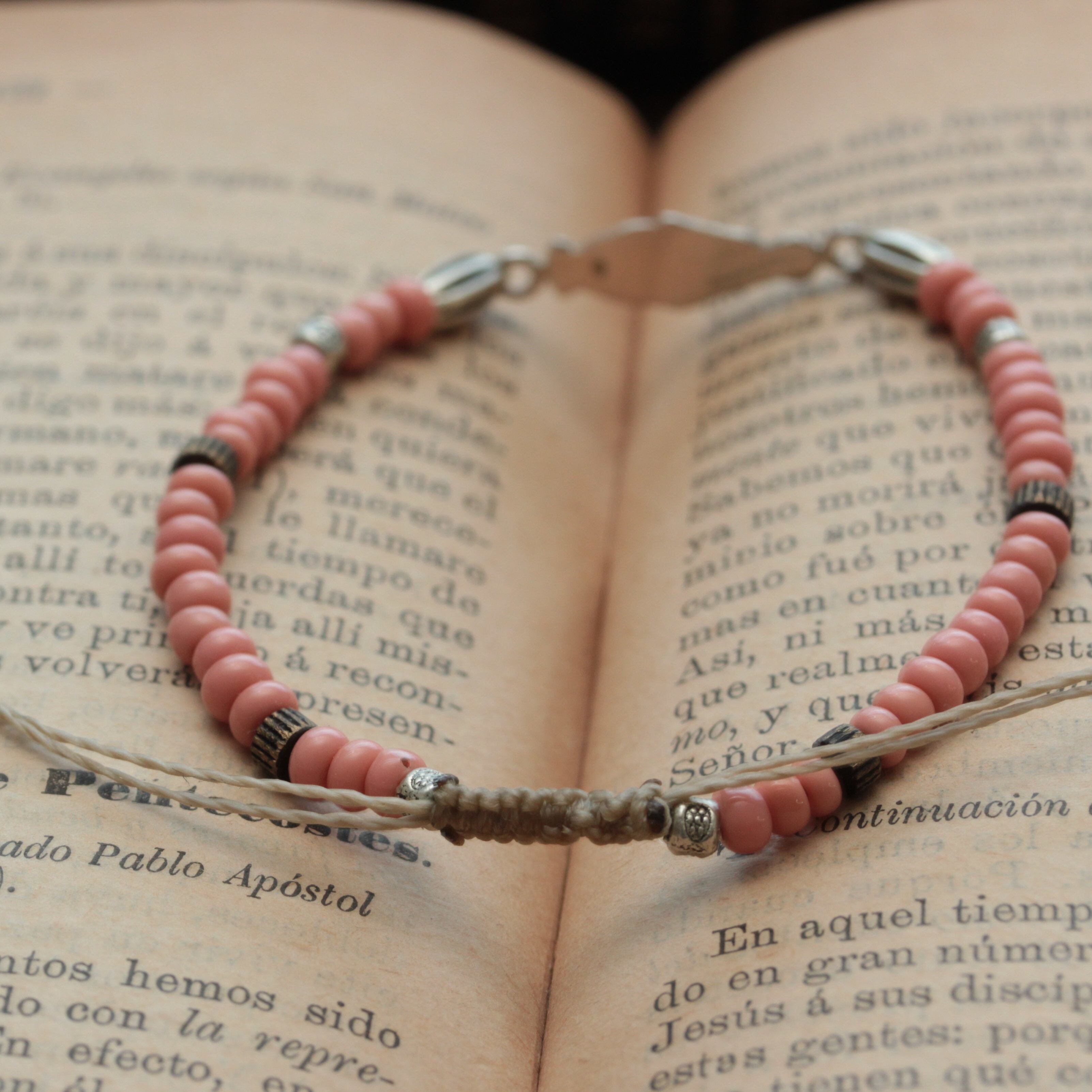 ♪ご覧いただき有難うございます♪ ヴェネチアン産ピンクマサイビーズを ワックスコードで組み込みセンターに ブラスビーズ&シルバー925マリアをあしらったブレスレットです。 男女兼用でお使いいただけます。 サイズ:ぐるりで16.5cm 5%前後の誤差はご了承ください。 クオリティ:ヴェネチアン産ピンクマサイビーズ・シルバー925・ブラスビーズ