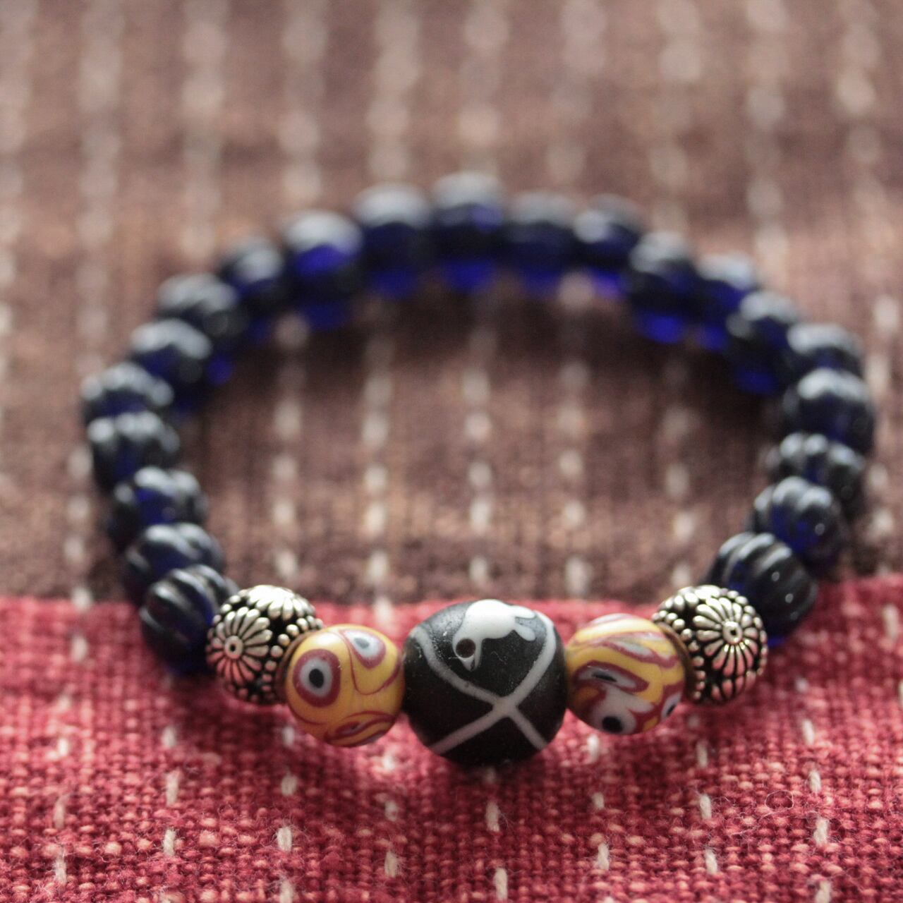 ♪ご覧いだき有難うございます♪ ナガ族 ヴィンテージ瑠璃色蜜柑玉をメインに ジャワ玉・アンティークブラスビーズを シリコンゴムで組み込みセンターに再生玉のマニックブルンを あしらったブレスレットです。 男女兼用でお使いいただけます。 ※ゴム仕様なので着脱が簡単です。 サイズ:ぐるりで18cm 5%前後の誤差はご了承ください。 クオリティ:ナガ族 ヴィンテージ瑠璃色蜜柑玉・ジャワ玉・ブラスビーズ