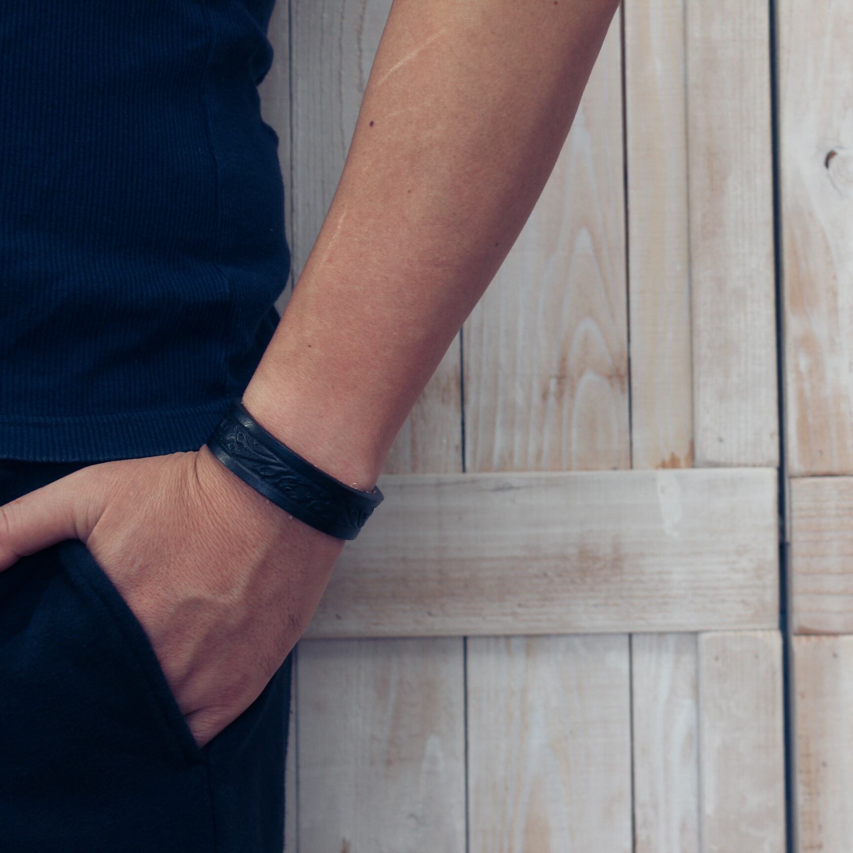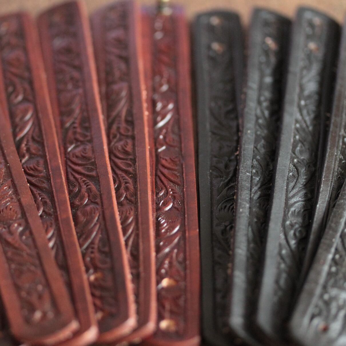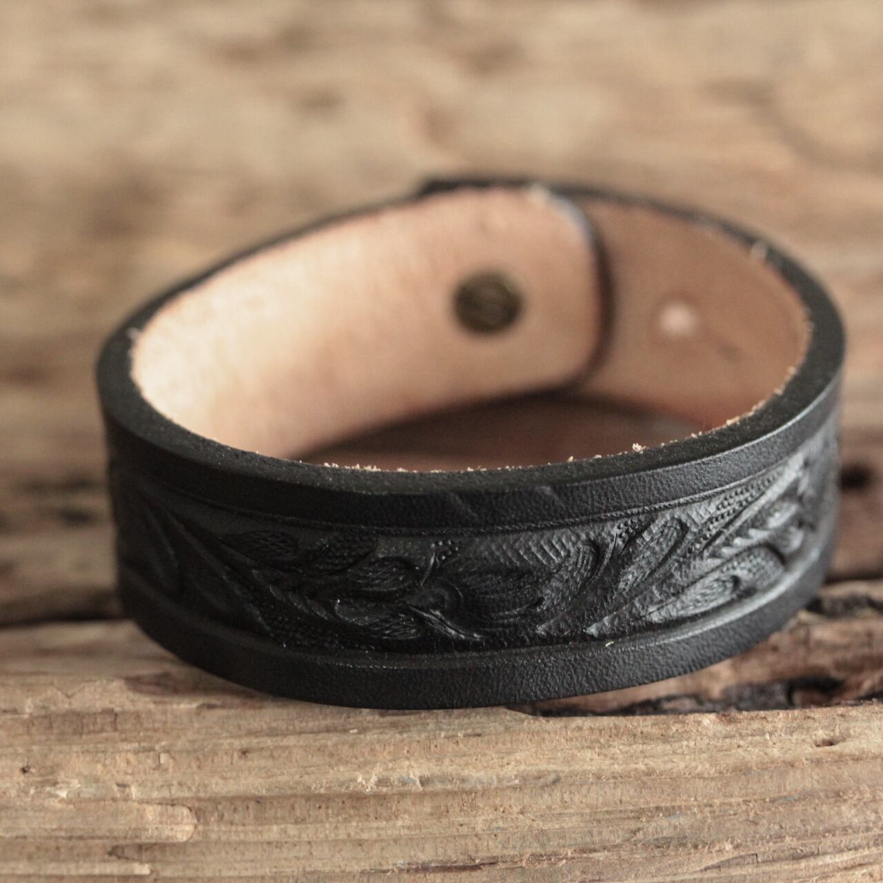 ♪ご覧いただき有難うございます♪ 牛革にカービングを施したレザーバングルです。 男女兼用でご利用頂けます。 カービングのために少し厚めのレザー使用しているため 最初は少し固めですが、馴染んでくると柔らかくなり 革の質感もよくなります。 サイズ:巾 2cm 全長22cm 装着サイズ:18cm・20cm 3%前後の誤差はご了承ください。 クオリティ:牛革