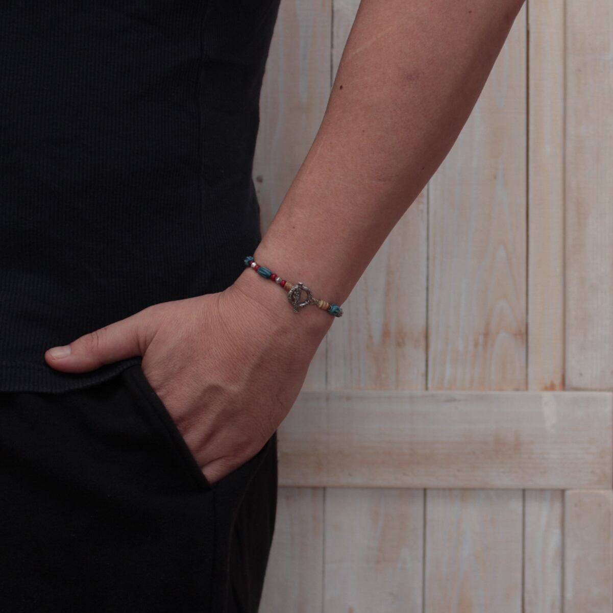 ♪ご覧頂き有難うございます♪ 藍染ビーズのブレスレットに シルバー925マンテルのエンドと ブラスビーズ&ホワイトハーツを ワックスコードで組み込んだブレスレットです。 ※男女兼用でお使いいただけます。 サイズ:18㎝ ※3%前後の+-誤差はご了承くださいませ。 クオリティ:藍染ビーズ・ホワイトハーツ ・シルバー925・ブラスビーズ