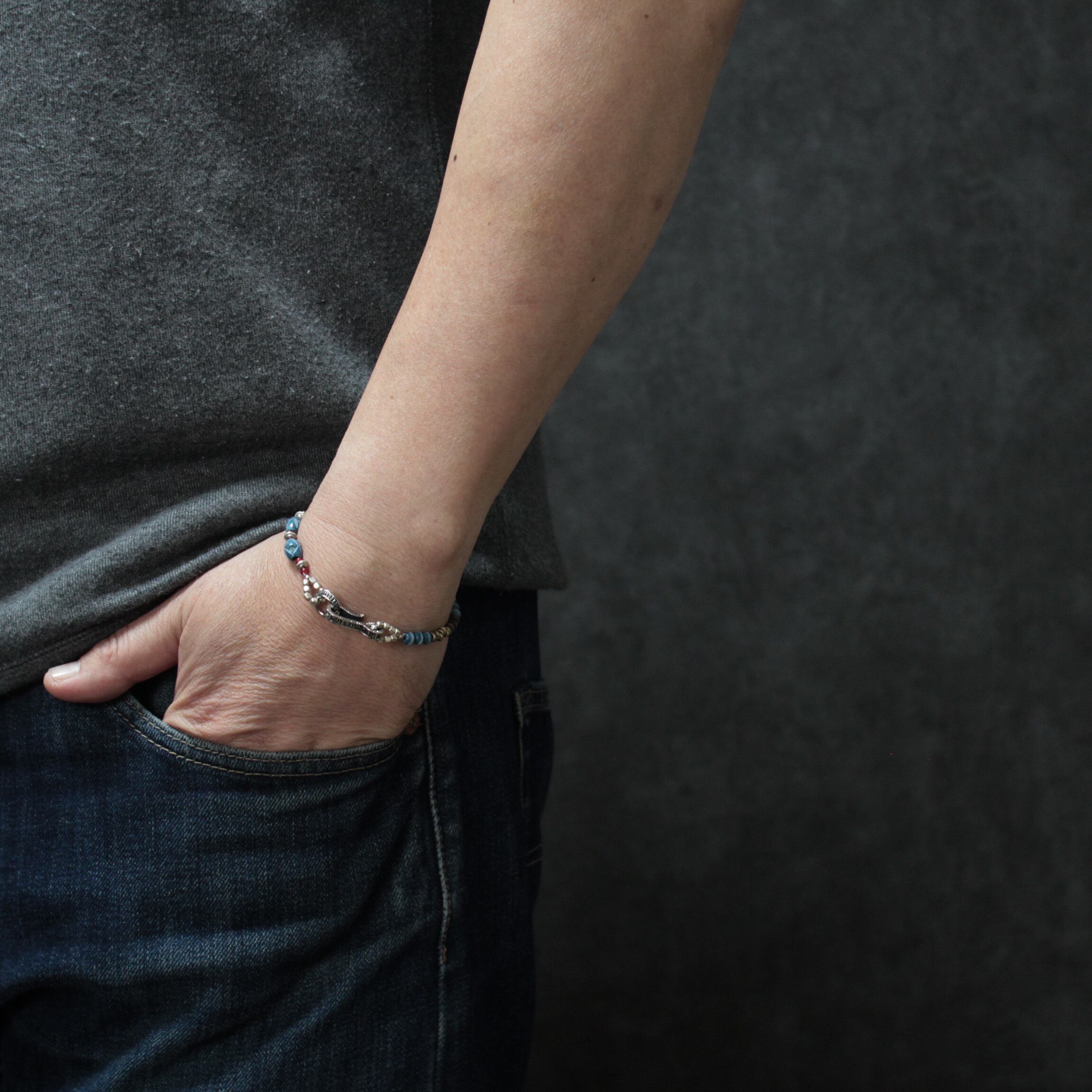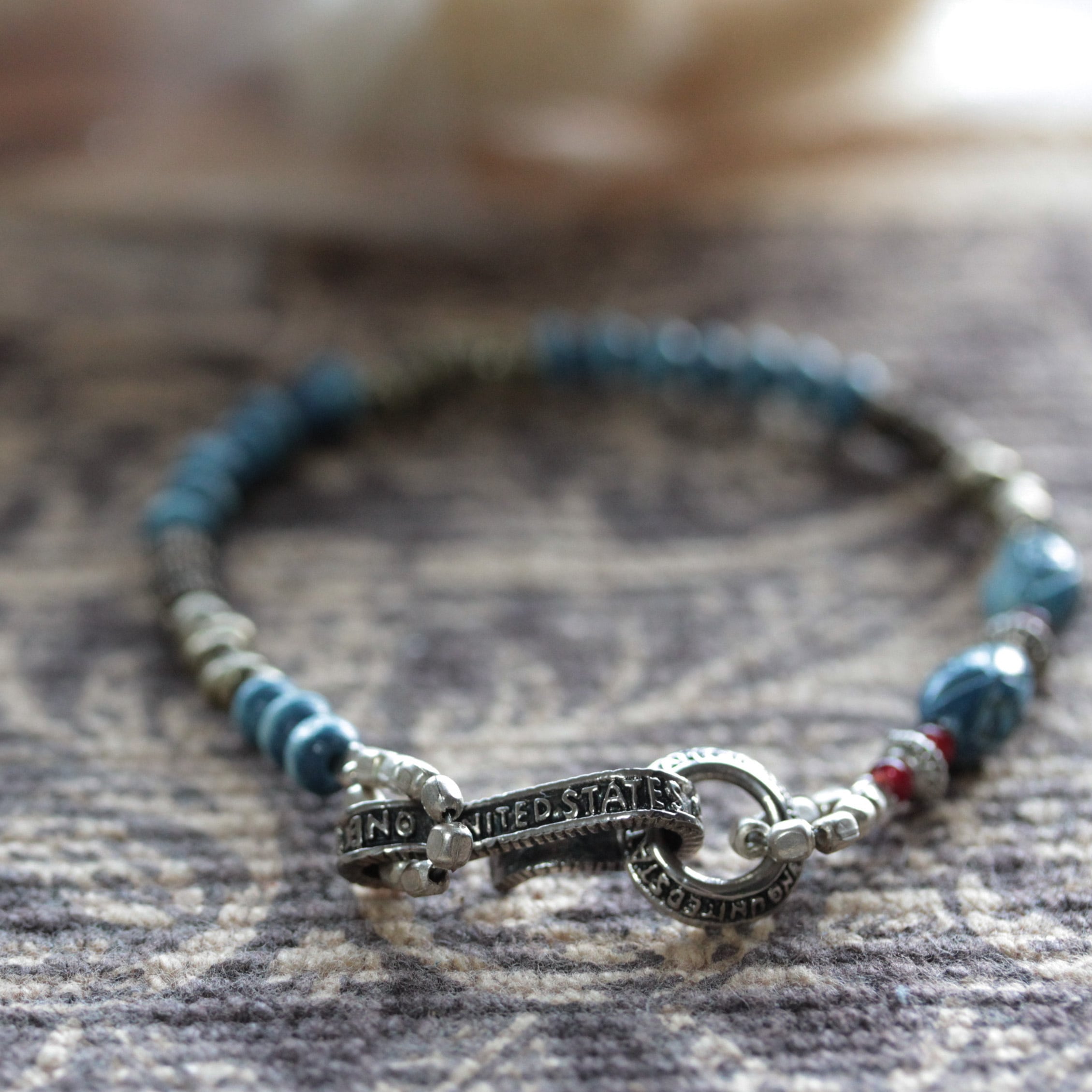 ♪ご覧頂き有難うございます♪ 藍染ビーズ&Vintage brass beadsブレスレットに モルガンコインモチーフのエンドと ホワイトハーツを組み込んだブレスレットです。 ※男女兼用でお使いいただけます。 サイズ:18㎝ ※3%前後の+-誤差はご了承くださいませ。 クオリティ:藍染ビーズ・ホワイトハーツ ・ブラス