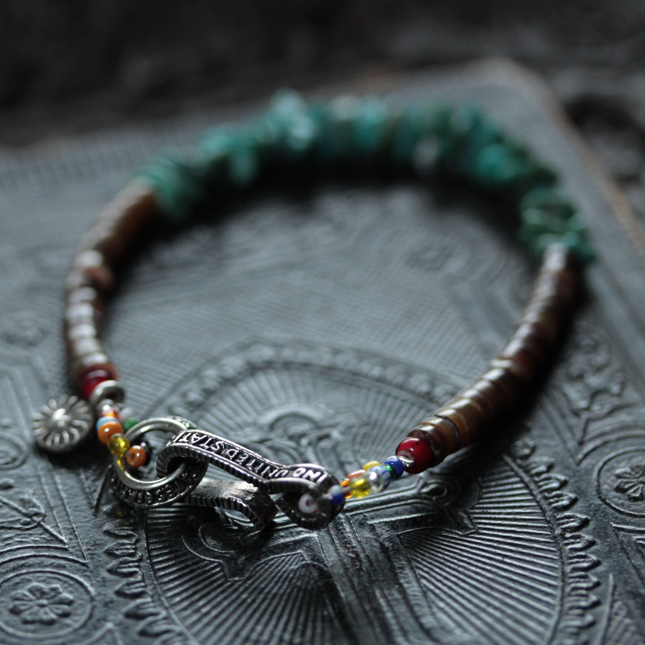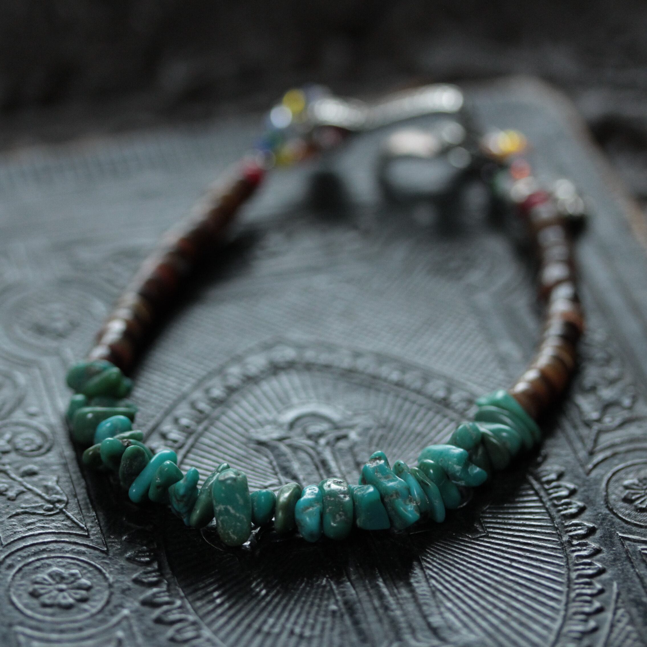 ♪ご覧頂き有難うございます♪ *shell & turquoiseブレスレットに モルガンコインエンドを組み込んだブレスレットです。 ※男女兼用でお使いいただけます。 サイズ:19㎝ ※3%前後の+-誤差はご了承くださいませ。 クオリティ:Black Pearl ・ Silver925