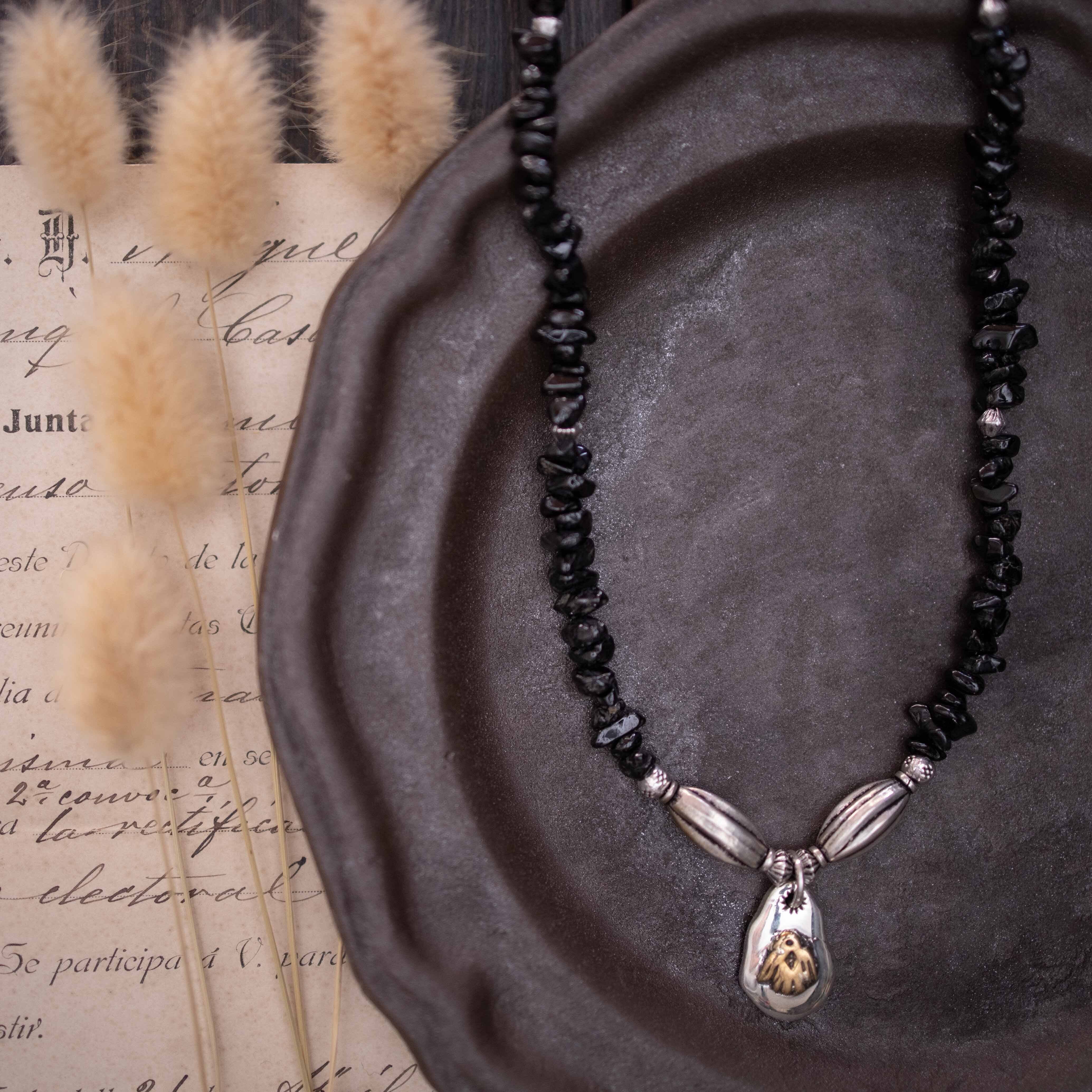 ♪ご覧いただき有難うございます♪ サザレブラックスピネル&メタルビーズを組み込み トップにシルバー925チャームをあしらったネックレス です。 男女兼用でお使いいただけます。 2Rapアンクレットでもおつかいいただけます。 サイズ:47cm 5%前後の誤差はご了承ください。 クオリティ:サザレブラックスピネル・ メタルビーズ・シルバー925